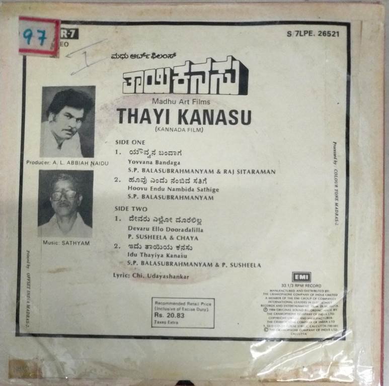 Thayi Kanasu Kannada film EP Vinyl Record by Sathyam