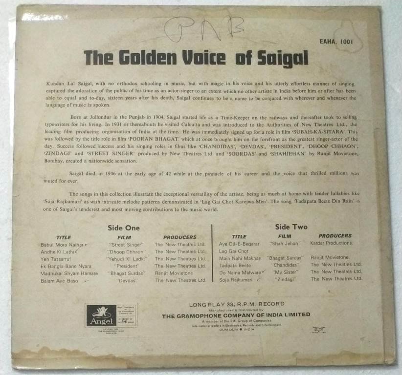 The Golden Voice of K L Saigal Hindi Film songs LP Vinyl Record