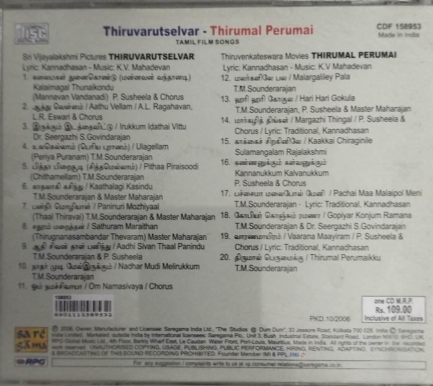 Thiruvarutselvar – Thirumal Perumai Tamil Film Audio CD by K V Mahadevan
