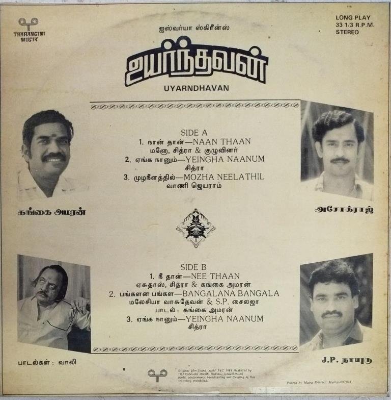 Uyarndhavan Tamil Film LP Vinyl Record by Gangai Ameran