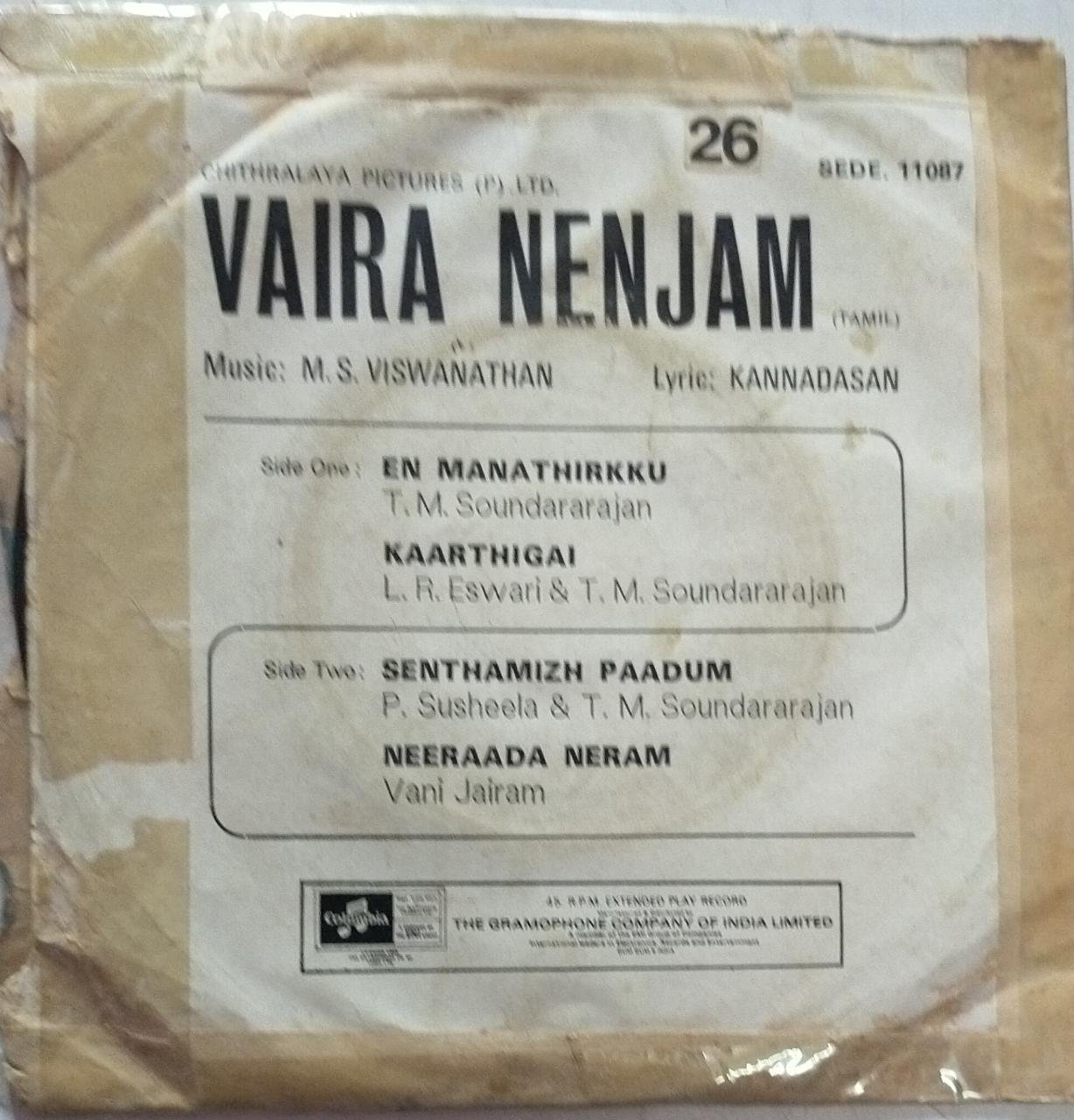 Vaira Nenjam Tamil Film EP Vinyl Record by M.S.Viswanathan
