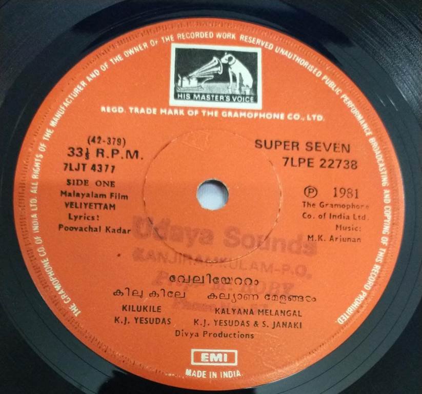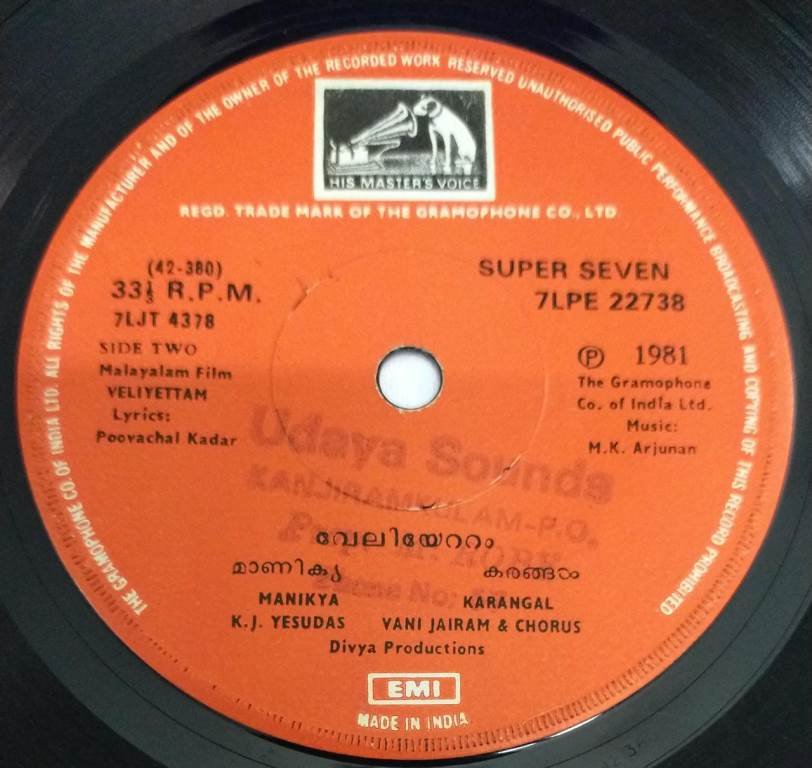 Veliyettam Malayalam Film EP Vinyl Record by MK Arjunan 22738